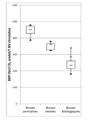 La capacité des boues à produite du méthane, que l'on mesure par leur potentiel méthanogène ou BMP (Biochemical Methane Potential) est cependant différente selon leur origine (voir figure 3).