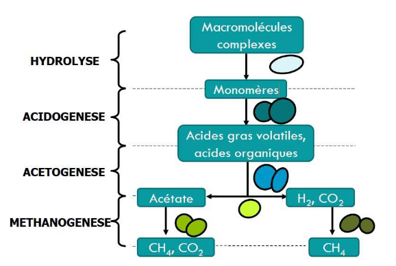 - L’acidogenèse : les monomères résultants sont ensuite transformés en composés encore plus simples : acides gras volatils (AGV), acides organiques, alcools, hydrogène et gaz carbonique ;