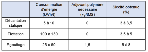 Figure 2 : Éléments de comparaison des différents procédés d'épaississement des boues ; Source : d'après Amorce (2012) et Amorce (2019).