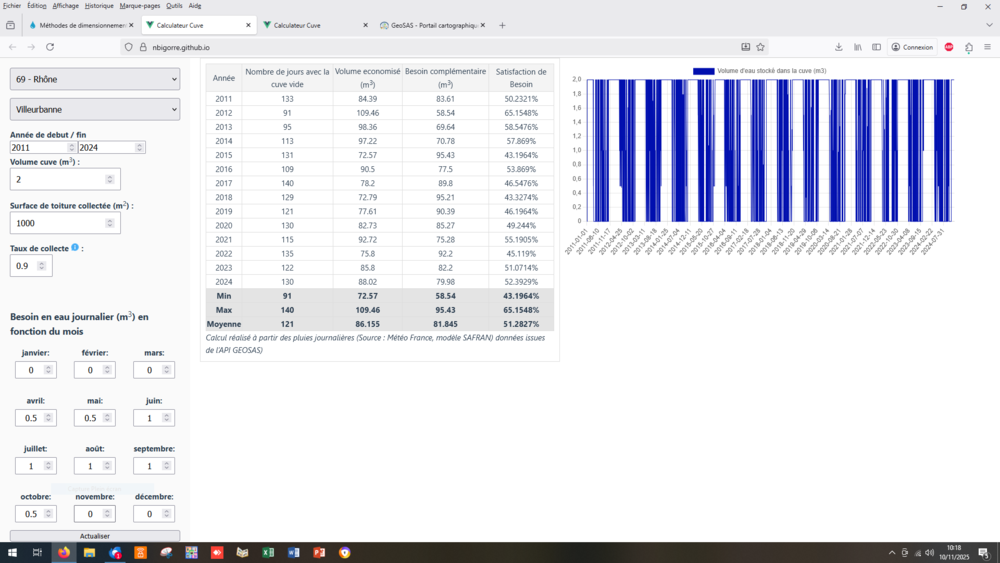 Cet outil, très simple d'utilisation, récupère automatiquement les données pluviométriques journalières du modèle Safran de Météo-France selon la position du projet. Il simule le fonctionnement du dispositif pour une période de plusieurs années en fonction du volume de la cuve, des besoins mensuels et de la surface de toiture ('figure 3).