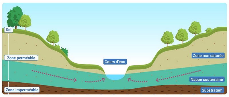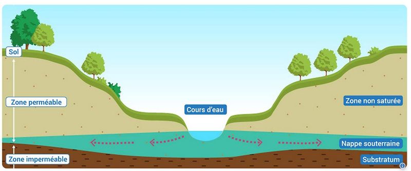 - Enfin les échanges permanents entre l'eau de surface et l'eau de la nappe alluviale constituent un élément déterminant pour maintenir des conditions favorables dans le cours d'eau. Ces échanges permettent par exemple d'abaisser la température de l'eau de surface ou de maintenir sa concentration en oxygène dissous.