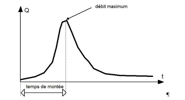 Au cours d'une crue, temps nécessaire pour que le débit passe de sa valeur habituelle (début du temps de base) à son maximum. | Au cours d'une crue, temps nécessaire pour que le débit passe de sa valeur habituelle (début du temps de base) à son maximum. | ||