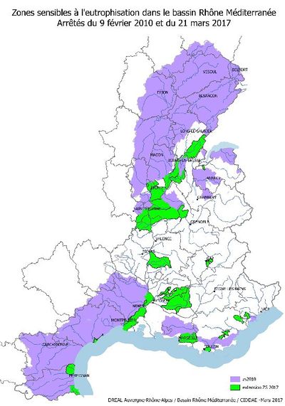 Notion introduite par la Directive eau résiduaire urbaine pour désigner les milieux devant faire l'objet d'une protection spéciale, en particulier vis à vis de la pollution par les nitrates et les phosphates. Cette directive européenne a été transposée en droit français avec le décret n° 94-469 du 3 juin 1994 concernant la collecte et le traitement des eaux usées. Les cartes des zones sensibles ont été arrêtées par le Ministre chargé de l'environnement et sont actualisées au moins tous les 4 ans dans les conditions prévues pour leur élaboration. Il serait préférable e toujours parler de "zones sensibles à l'eutrophisation" pour éviter toute confusion avec d'autres types de zones sensibles (Zones urbaines sensibles par exemple).