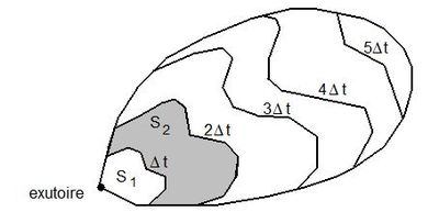Une courbe isochrone (ou ligne isochrone) est définie comme l'ensemble des points d'un bassin versant tels que le temps mis par l'eau pour parcourir le trajet entre le point considéré et l'exutoire soit égal à une valeur donnée. On suppose en général que ce temps est constant, c'est à dire indépendant du débit instantané et de son évolution précédente. Si ces hypothèses sont vérifiées, tout bassin versant peut être décomposé en sous bassins limités par des courbes isochrones. Sur l'exemple de la figure 1, le bassin versant a ainsi été décomposé en 6 sous bassins, limités par des courbes isochrones séparées par des durées fixes et égales à $ Δt $. Par exemple la pluie précipitée sur la surface $ S_2 $ délimitée par les lignes isochrones $ Δt $ et $ 2.Δt $ arrivera à l'exutoire avec un temps de retard compris entre $ Δt $ et $ 2.Δt $.